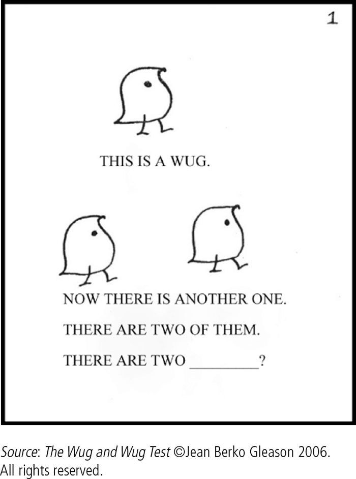 The “Wug Test” is used to gauge how well children have internalized English grammatical rules. The expected answer is Wugs – but some humorous results include Wuggen, Weeg, or Wuggi.